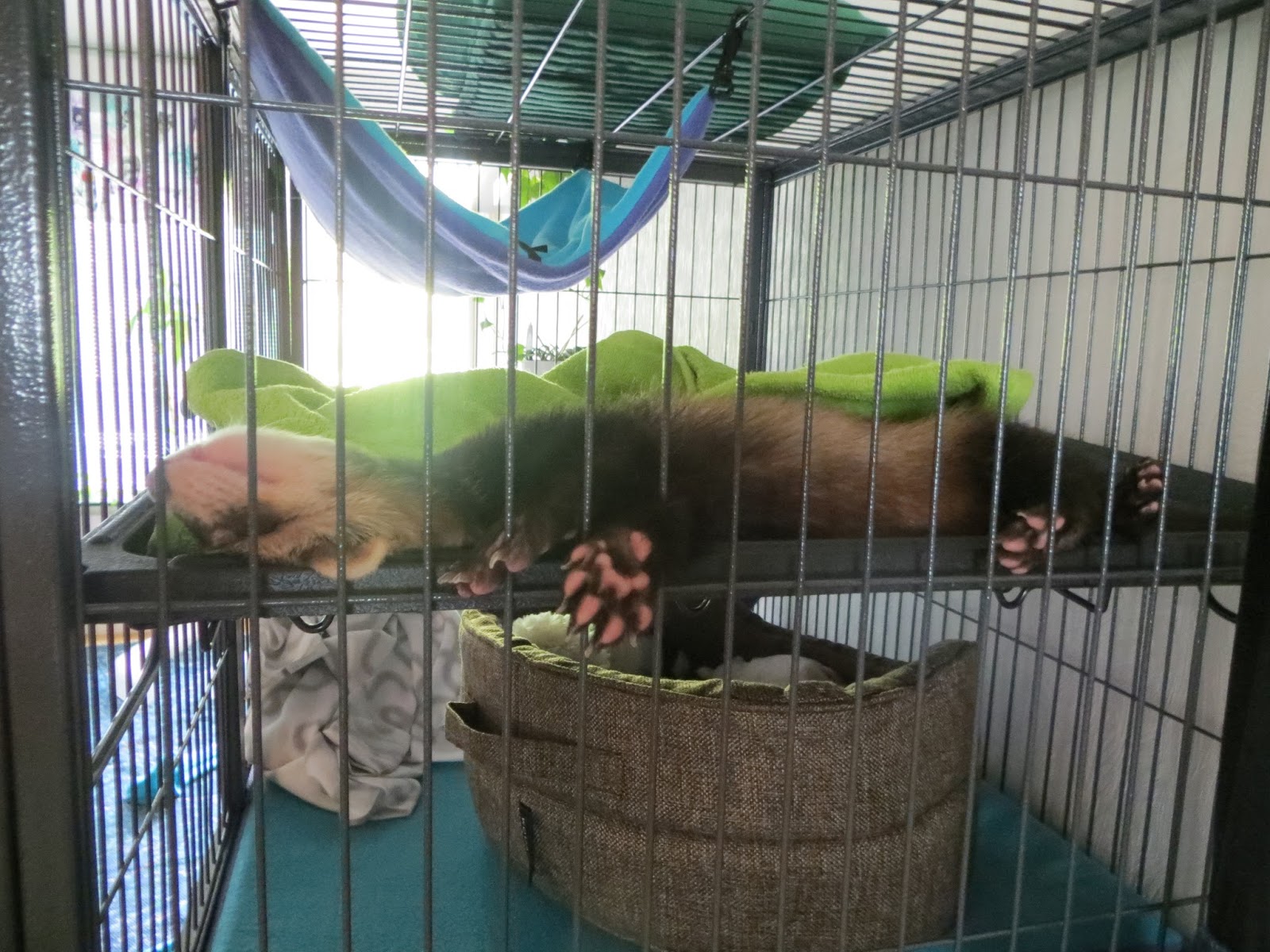 Elämme näätälapsen kanssa on muuttunut varsin tasaiseksi, arkiseksi. Aamuisin mies päästää Kasperin herättyään leikkimään, minä laitan takaisin kouluun lähtiessä. Kun tulen koulusta (mulla lähinnä puolikkaita päiviä), niin päästän sen riehumaan. Osaa päivällä olla kovin riiviö, kun on aamulla saanut leikkiä vain n. tunnin ajan. Keksii kaikkea jäynää ja uutta jekkua. Vakioksi on muodostunut sohvan repiminen. Sitten se nukkuu vielä muutaman tunnin ja miehen tultua töistä riehuu pari tuntia, taas nukutaa ja illalla ennen nukkumaan menoa riehuu taas. On siis hereillä n. 4 krt, 1-2,5h kerralla. Nukkuu saman verran pätkissä.
